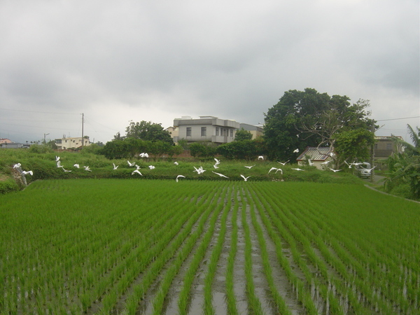 在村外的農田邊,一停下來拍照,原本在田間覓食的白鷺鷥全都飛起來了